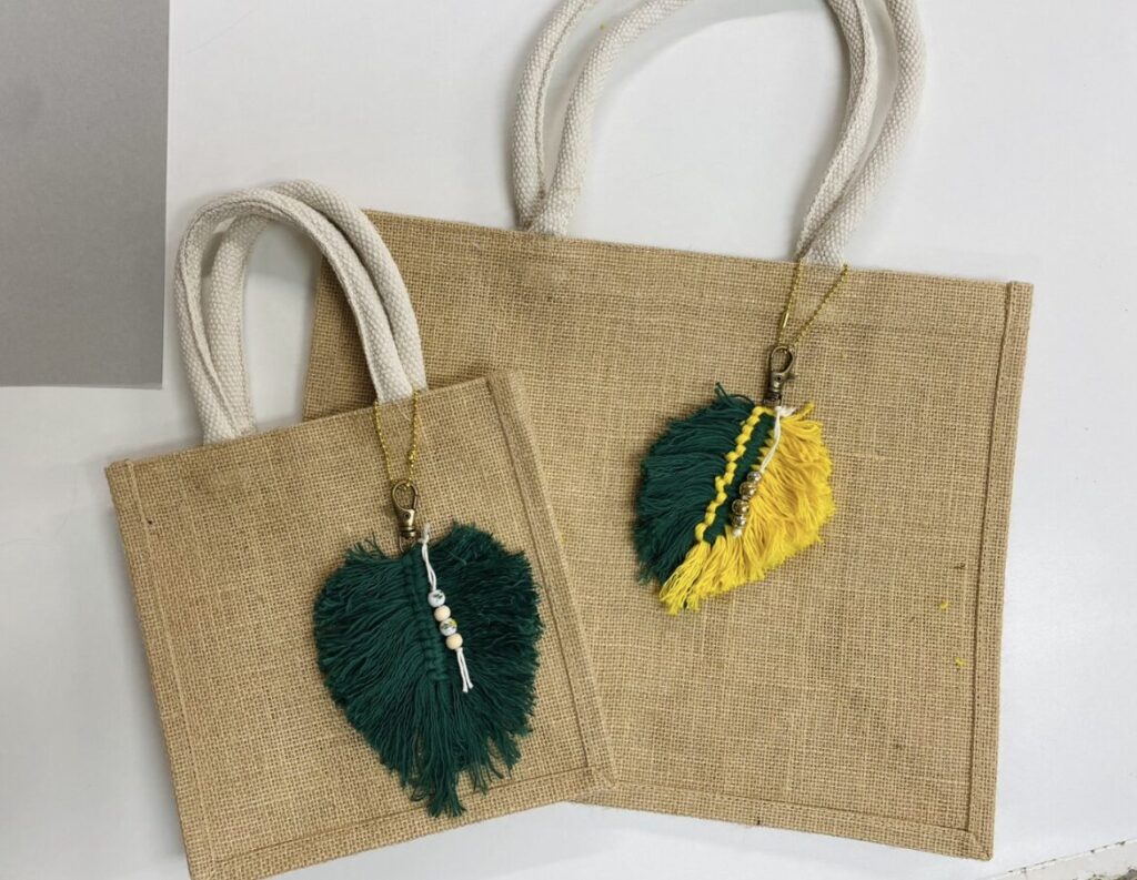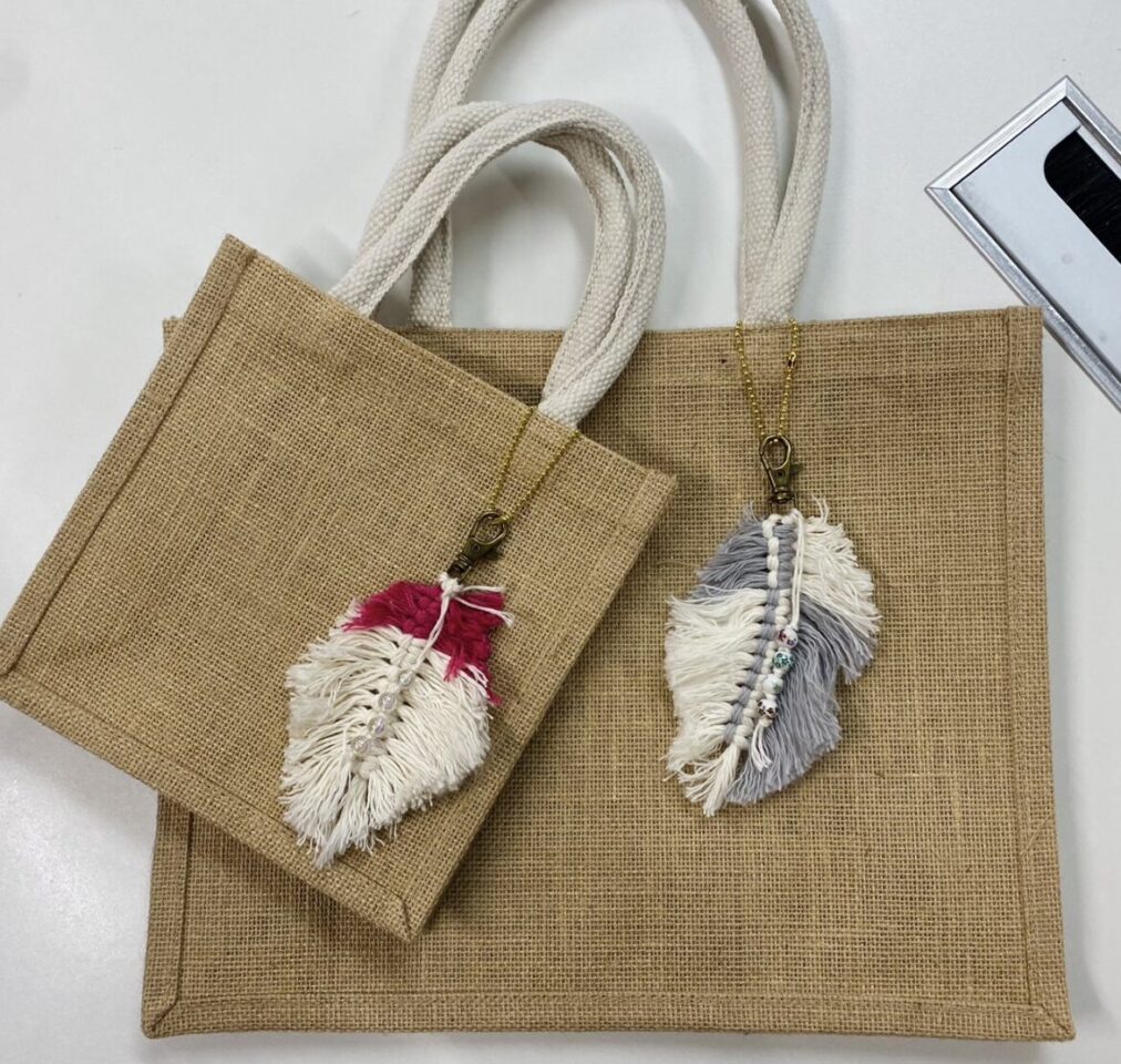 こちらはマクラメのチャームをつけたジュートバッグです☆